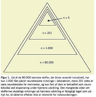 I betragtning af forskellene i nervesystemets sårbarhed må man formode, at alle disse stoffer vil være særlig farlige under hjernens udvikling. Vi søgte derfor publicerede undersøgelser på dette felt i National Library of Medicines databaser. På trods af forskellen i sårbarhed fandt vi kun fem stoffer, for hvilke der var sikker dokumentation for påvirkning af hjernens udvikling. Disse fem stoffer repræsenterer toppen af et meget stort isbjerg (Figur 1).