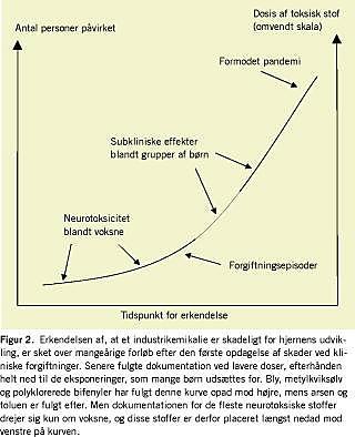De fem bedst dokumenterede stoffer viser det samme forløb med tidlig påvisning af neurotoksisk påvirkning i arbejdsmedicinske undersøgelser eller forgiftningsepisoder og senere erkendelse af vidt udbredte effekter på hjernens udvikling efter årtiers forskning, hvorefter forebyggelse er sat i gang med yderligere forsinkelse (Figur 2). På trods af den øgede sårbarhed af nervesystemet, mens det er under udvikling, er dokumentationen for skadelige virkninger sparsom. Dette paradoks skyldes ikke fravær af negative påvirkninger, men derimod de store omkostninger og forsinkelsen ved gennemførelse af epidemiologiske undersøgelser.