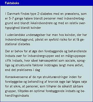 I Danmark findes type 2-diabetes med en væsentlig højere prævalens blandt personer med indvandrerbaggrund end blandt ikkeindvandrere, og med en relativ overhyppighed blandt kvinder. Personer med indvandrerbaggrund kan pga. sociale, personlige og/eller »etniske« forhold tilhøre gruppen af såkaldt sårbare patienter, som har behov for en særlig målrettet forebyggende og behandlende indsats. Den foreløbige kortlægning af aktiviteter omkring forebyggelse og behandling peger på, at indsatsen kan og skal styrkes.