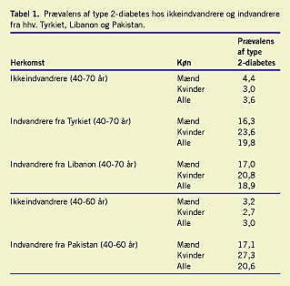 I et registerstudie, hvori man inkluderende 2,5 mio. per-soner, der var > 15 år og bosat i Hovedstadsregionen eller Region Midtjylland påviste man, at såvel mænd som især kvinder med indvandrerbaggrund fra Tyrkiet, Pakistan, Eks-jugoslavien, Libanon, Irak/Iran, Somalia og Marokko havde en relativt større hyppighed af heldøgnsindlæggelser og ambulatoriebesøg under diagnosen type 2-diabetes end ikkeindvandrere (kvinder: relativ risiko (RR): 1,53-5,13, mænd: RR: 1,77-5,06), når der blev korrigeret for aldersforskelle og forskellige sociovariable [2]. Forskellene kan være udtryk for en øget sygelighed, men også andre faktorer, som f.eks. sygdomsadfærd og sundhedsvæsenets indsats kan være medvirkende årsager til den relativt høje kontaktrate blandt personer med indvandrerbaggrund. I samme studie påviste man en tendens til, at såvel mænd som kvinder med indvandrerbaggrund havde en relativt lavere kontaktrate til sygehusvæsenet under diagnosen iskæmisk hjertesygdom end ikkeindvandrerbefolkningen. Derudover findes der ingen viden om hyppigheden af diabetiske senkomplikationer blandt personer med indvandrerbaggrund i Danmark.