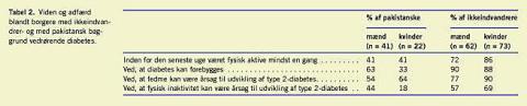 I en undersøgelse fra Københavns Amt har man påvist, at indvandrere af pakistansk herkomst er mindre fysisk aktive end ikkeindvandrerbefolkningen, og at specielt kvinder af pakistansk herkomst har en ringere viden om forebyggelse af diabetes end andre kvinder [1] (Tabel 2 ). Resultaterne af udenlandske undersøgelser peger på samme tendens til, at indvandrere har en ringere viden om diabetessygdommen end ikkeindvandrerbefolkningen, og at det især gælder for kvinderne [5].