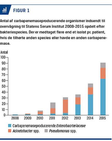 bekymring. Begrebet dækker over carbapenemaseproducerende Enterobacteriaceae (CPE), Pseudomonas aeruginosa og Acinetobacter baumannii. Carbapenemaser er enzymer, som nedbryder carbapenemer (f.eks. meropenem) og tit alle andre betalaktamantibiotika. De er hyppigt plasmidbårne, dvs. generne kan spredes horisontalt til andre bakterier og har et stort potentiale for smittespredning. Der findes flere forskellige grupper af carbapenemaser, f.eks. Klebsiella pneumoniae-carbapenemase (KPC), New Delhi-metallobetalaktamase (NDM) og OXA-48-gruppen. Globalt set er der store regionale forskelle i forekomsten af CPO [1]. På danske sygehuse ses der en foruroligende stigning af CPO (Figur 1), og der er beskrevet flere udbrud med CPE siden 2012 [2].