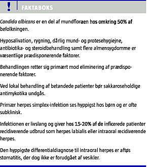 Summary Infections of the oral mucosa Ugeskr Læger 2010;172(44):3023-3026 The most common infections of the oral mucosa are those caused by Candida albicans and herpes simplex virus (HSV). Candidosis occurs as pseudomembraneous, erythematous and hyperplastic types with varying symptoms from no to a burning sensation. Treatment most importantly includes elimination of any predisposing factors such as smoking, sub-optimal denture hygiene and hyposalivation. A primary HSV infection results in a life-long latent infection recurring in some infected persons either intraorally or on the lip. If treatment is indicated, topical or systemic aciclovir and related drugs can be used.