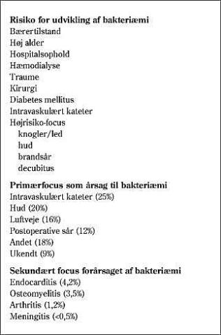 Hyppigheden af S. aureus- bakteriæmier er markant stigende over de sidste 30 år og er nu 1,18 per 1.000 hospitalsindlæggelser (egne ikke-publicerede data). Overgang af bakterier fra et primært focus til blodet afhænger af en række faktorer, såsom det primære focus (sted, størrelse), værtens immunologiske status, muligheder for at fjerne focus samt behandlingen i øvrigt.