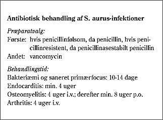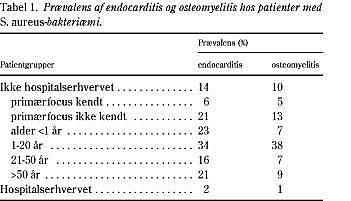 Patienter, der udvikler bakteriæmi, har ofte risikofaktorer (18, 19). Et primærfocus påvises i mere end 90% af tilfældene, mens der hos ca. 10% af patienter med bakteriæmi kan påvises et sekundært focus. Hvis primærfocus kan saneres, er mortaliteten lavere, end hvis focus ikke kan saneres (20). Det er væsentligt at identificere et eventuelt sekundært focus hos patienterne, idet behandlingstiden i så fald skal være væsentlig længere, end hvis det alene drejer sig om behandling af et primærfocus. Patienter, der har erhvervet S. aureus- bakteriæmi uden for hospital, bør undersøges for osteomyelitis og endocarditis, specielt hvis der ikke kan påvises et primærfocus for bakteriæmien (21) (Tabel 1 ). Ekkokardiografi er indiceret, hvis bakteriæmien er uden kendt focus. Man må være opmærksom på, at hos op til 50% af patienter med S. aureus- endocarditis finder man ingen hjertemislyd (1, 22). Endocarditis i form af trikuspidalinfektion findes stort set kun hos i.v. misbrugere. Den antibiotiske behandling skal omfatte et penicillinasestabilt penicillin administreret intravenøst. I de sjældne situationer, hvor patienten er inficeret med MRSA eller er allergisk over for penicillin, anvendes sædvanligvis vancomycin. Hos patienter, hvor primærfocus er saneret, kan man nøjes med at behandle 10-14 dage. Hos patienter med ikke kendt eller ikke saneret primærfocus bør behandles længere afhængigt af det kliniske respons. Patienter med endocarditis behandles i mindst fire uger (22, 23).