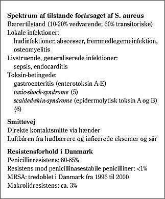 Spektret af infektioner med Staphylococcus aureus strækker sig fra relativt banale, lokale hudinfektioner til svære, generaliserede tilstande. I Danmark er mere end 85% af alle S. aureus penicillinresistente, mens meticillinresistens findes hos under 1%. Isoxazolylpenicillinerne er derfor fortsat de vigtigste antibiotika og foretrækkes frem for cefalosporiner. For det meste anvendes dicloxacillin, der er mest penicillinasestabilt. Ved resistens over for β -laktam-antibiotika har diverse kombinationer med makrolidantibiotika, fusidin, aminoglykosider, fluorquinoloner og rifampicin en vis effekt, men oftest anvendes vancomycin. Flere nye stoffer, bl.a. oxazolidinoner (linezolid) og streptograminer (dalfopristin og quinopristin) med effekt på meticillinresistente stammer er på vej. Den antibiotiske behandling kan sjældent stå alene, men må kombineres med fjernelse af focus, hvor dette er muligt. I artiklen gennemgås klinik og behandling for en række almindeligt forekommende infektioner med S. aureus.