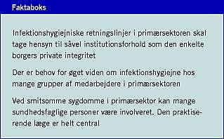 På et hospital er hygiejnen en del af driftsopgaven, og regionen er ansvarlig for, at der etableres de fornødne forholdsregler og uddannelse af personale under ledelse af en infektionshygiejnisk organisation. En tilsvarende infektionshygiejnisk organisation findes ikke i primærsektoren. Derfor er håndteringen og rådgivningen af personale på plejehjem, i daginstitutioner og i skoler mere heterogen og til dels afhængig af de kommunale indsatser. Nedenfor omtales forskellige infektionshygiejniske problemstillinger i primærsektoren, nogle af de aktører, som er tilknyttet, og ønsker for fremtiden.