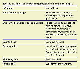 I daginstitutioner og på skoler vil børn og voksne have tæt, langvarig kontakt, hvilket giver risiko for smittespredning. Eksempler på hyppige infektioner, som kan volde problemer i institutionsområdet og give anledning til smittespredning, ses i Tabel 1 .
