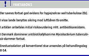 Summary Infection control to prevent tuberculosis in relation to resistance to antibiotics Ugeskr Læger 2011;173(12):880-883 Infection control differs among nations. Notably in USA strict measures are enforced to prevent air-borne tuberculosis (TB) transmission. In several European countries focus is on droplet transmission, close to patients. In the absence of strict evidence to resolve this divergence, an empiric, Danish guideline for infection control in hospitals is presented. If multi-drug resistant (MDR) TB is documented or suspected, according to risk-factors, patients should remain under air-borne precautions. The vast majority of Danish TB-patients (non-MDR) require less demanding, hygienic precautions.