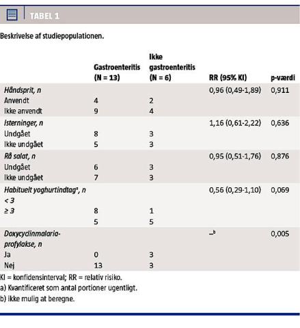 Der blev fundet en signifikant association med anvendelse af doxycyclin som malariaprofylakse (p = 0,005). Ingen af de tre deltagere, der tog doxycyclin, fik diarré, hvorfor RR ikke kan beregnes.