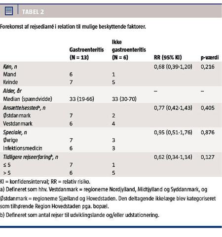 Resultater: Størstedelen af deltagerne fik symptomer på akut gastroenteritis uafhængigt af speciale og alder. Der var en signifikant beskyttende effekt af doxycyclin og en mulig beskyttende effekt af højt yoghurtindtag. Der var ingen effekt af at undgå isterninger, rå salat eller anvende håndsprit. Selvmedicinering med antibiotika var associeret med kvindeligt køn, højere alder, tidligere rejseerfaring, ansættelse i Østdanmark og ikkeinfektionsmedicinsk speciale, om end ikke statistisk signifikant.