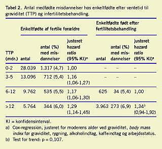 Tabel 2 viser, at misdannelseshyppigheden var stigende med stigende ventetid til graviditet.