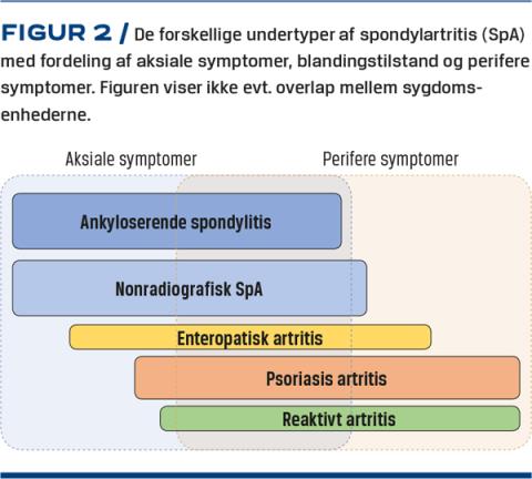 SpA er en paraplydiagnose, som dækker et spektrum af kroniske inflammatoriske rygsygdomme. Ætiologien til de forskellige sygdomsenheder er ikke kendt, men de deler immunologiske patofysiologiske træk [4]. De forskellige undertyper og sygdomspræsentationer har medført en del begrebsforvirring. SpA inddeles klassisk i ankyloserende spondylitis (AS) – også kendt som morbus Bekhterev – nonradiografisk SpA, psoriasisartritis, enteropatisk artritis og reaktiv artritis (Figur 2) [5]. Nonradiografisk SpA dækker over tilstanden, hvor der ikke ses forandringer på røntgenbilleder, men udelukkende er påviselige fund på MR-skanningsbilleder [6]. De øvrige undertyper dækker over tilstande hos patienter med ledsagende psoriasis, inflammatorisk tarmsygdom eller forudgående infektion, når patienterne også har ledhævelser og/eller aksial sygdomsinvolvering. En anden – og måske mere retvisende – inddeling er perifer SpA og aksial SpA afhængigt af lokalisationen for den største symptombyrde (Figur2). Prævalensen er estimeret til ca. 1% for SpA og 0,5% for AS.