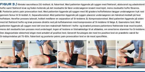 Undersøgelse af en patient, hos hvem der er mistanke om inflammatorisk rygsygdom indeholder almindelig rygundersøgelse inkl. målrettet neurologisk undersøgelse og supplerende til dette SI-ledtest. Bevægemønstret er pga. inflammationen karakteriseret ved langsom igangsætning og stivhed – uden at bevægeudslaget nødvendigvis er indskrænket. De fem test i Figur 3 anvendes til vurdering af SI-ledssmerter [9]. Testene er positive, når de reproducerer patientens kendte symptomer.