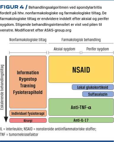 Behandlingen sigter mod at nedsætte inflammation, mildne ekstraartikulære manifestationer og reducere komorbiditet [18]. Foruden nonfarmakologiske tiltag (sygdomsedukation, rygestop og træning) er behandlingsmulighederne inflammationsdæmpende behandling med NSAID og biologisk terapi (Figur 4). Intraartikulære glukokortikoidinjektioner og sulfasalazinbehandling er reserveret til patienter med perifer SpA [19]. Formålet med behandlingen er at dæmpe patientens symptomer og forhindre udvikling af strukturelle forandringer.