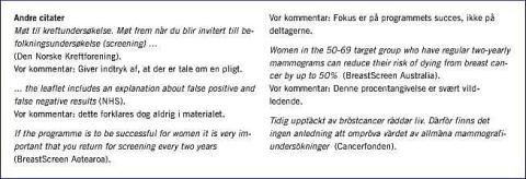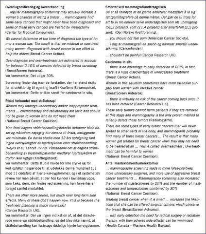 Det er bekymrende, at så få hjemmesider lever op til den accepterede standard for informeret samtykke [4], især fordi man kan overbevise folk om deltagelse eller ej, ved at tilbageholde eller medtage bestemt inform ation [7]. At nævne, at screening reducerer risikoen for at dø af brystkræft med 30% [8], er langt mere overbevisende end det tilsvarende udsagn - der stammer fra samme metaanalyse - at den absolutte risikoreduktion er 0,1% efter ti år [8]. På Kræftens Bekæmpelses hjemmeside er denne effekt tidoblet til 1%. Dette overdrevne tal forekommer også i Sundhedsstyrelsens redegørelse fra 1997 [9], hvori man anbefaler screening, og hvor resultaterne fra screeningsforsøgene ekstrapoleres langt ud over, hvad de kan bære. Der medtages således data for kvinder op til 80 år, og man antager, at de indtil denne alder ikke dør af andre årsager end brystkræft, og glemmer, at kun kvinder mellem 50 år og 69 år screenes.