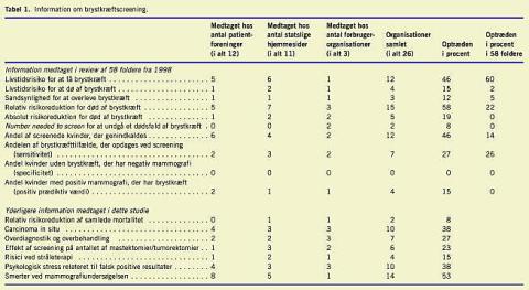 I et australsk studie fra 1998 af 58 foldere om mammografiscreening fandt man, at de var mangelfulde og ensidige og ikke gav det fornødne grundlag for et informeret samtykke [1]. I et andet studie fandt man, at kun 26 ud af 54 publikationer indeholdt nogen som helst information om skadevirkninger [2]. I Danmark benytter 47% af befolkningen internettet til at søge information om helbredsrelaterede emner [3]. Vi undersøgte derfor, om informationen på internettet er afbalanceret og medtager de nyeste forskningsresultater.