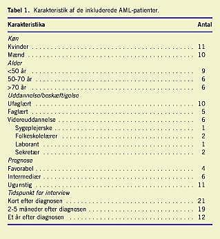 Enogtyve nydiagnosticerede AML-patienter, henvist til intensiv kemoterapi på Hæmatologisk Afdeling, OUH, blev inkluderet konsekutivt fra 1. juli 2000 til 30. juni 2001 (Tabel 1 ). Der blev planlagt tre interview med hver patient. Første gang var kort efter diagnosen, dernæst midtvejs i behandlingen og afsluttende et år efter diagnosen. På grund af død eller terminal sygdom blev hhv. 19 og 12 patienter interviewet to og tre gange.