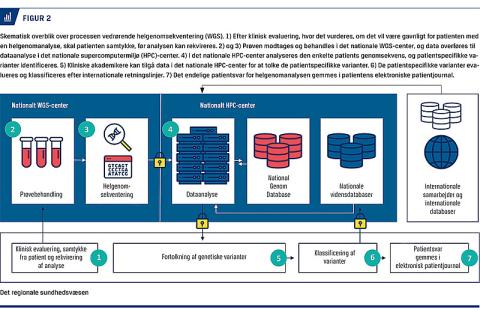 Selve genomsekvensen, variantanalysen og de værktøjer, der bruger disse, er placeret i NGC, og dermed er der ikke tale om kopiering af data til forskellige hospitaler med den risiko, det giver for datalækager og anden form for misbrug af data. Man tilgår data via overvåget login på NGC’s it-systemer. Patientsvaret vil i sin endelige udformning blive placeret i patientens elektroniske journal, da det er vigtigt for den videre lokale håndtering af patienten, f.eks. ved valg af behandling. Figur 2 er en skematisk oversigt over det kommende flow for en prøve, der skal helgenomsekventeres.