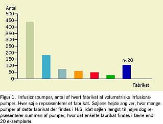 Resultater: H:S-sygehusene råder i alt over infusionspumper af 42 forskellige fabrikater. Af de 919 volumetriske infusionspumper har kun 71% sætbaseret friløbssikring. I 40% af de indberettede hændelser var der tale om en betjeningsfejl; den hyppigste fejl var forkert indstilling af infusionsraten. En anden stor gruppe af hændelser (27%) udgjordes af tilfælde, hvor infusionen var afbrudt på grund af frakobling eller afklemning af slangen; i denne gruppe fandtes to tilfælde af huskeanæstesi.