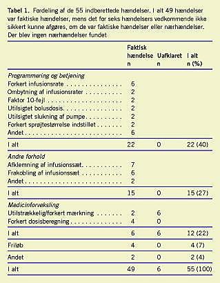 Søgningen i H:S Hændelsesdatabasen resulterede i 57 hændelser fra øvrige indberetninger og 99 hændelser vedrørende medicineringsfejl, i alt 156 hændelser. Efter den manuelle gennemgang af hændelserne, hvor dobbeltrapporteringer og rapporteringer, der ikke sikkert vedrørte infusionspumper, blev fjernet, resterede henholdsvis 14 og 41 hændelser, i alt 55 hændelser. Hændelsestyperne fremgår af Tabel 1 . Det bemærkes, at der ikke er rapporteret om nogen sikre nærhændelser. Fire hændelser havde så betydelige, karakteristiske fællestræk, at det ikke med sikkerhed kan udelukkes, at der er tale om dobbeltrapportering.