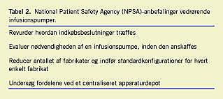 Konklusion: Centralisering af beslutningskompetencen om indkøb og etablering af et centralt pumpedepot med standardiseret udstyr kan formentlig reducere fejlrisiko og underudnyttelse af udstyr. Infusionspumpers brugervenlighed skal vurderes forud for indkøb. Dette skal undersøges med validerede redskaber og ikke blot som en afprøvning. Der er behov for større viden om design af brugervenligt medicinsk udstyr.