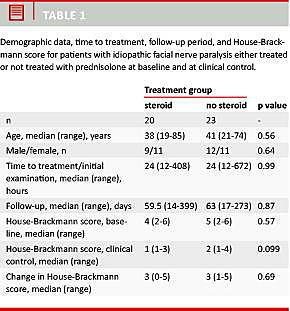 De to grupper adskilte sig ikke med hensyn til alder, køn, tid fra symptomdebut til behandlingsstart, observationstid eller sværhedsgrad af IFP ved behandlingsstart. Der var ingen forskel i ændringen i HB-score mellem patientgrupperne (delta-HB-score hhv. 3 (spændvidde: 0-5) og 3 (spændvidde: 1-5) for patienter behandlet med prednisolon versus patienter ikke behandlet med prednisolon, p = 0,69). Ved aldersstratificering sås for patienter, der var ældre end 40 år, en lavere HB-score ved followup for patienter, der var behandlet med prednisolon (median-HB: 1 (spændvidde: 1-2)) end hos patienter, som ikke modtog denne behandling (median-HB: 2 (spændvidde: 1-4)) (p = 0,02), men der var ingen forskel i absolut ændring i HB-score (p = 0,12). Blandt yngre patienter var der ingen effekt af steroid på paresegrad ved followup (p = 0,59). Ændring i HB-score var større blandt de ældste patienter (delta-HB: 4 (spændvidde: 2-5)) end blandt gruppen af yngre patienter (delta-HB: 2 (spændvidde: 0-5)), der modtog samme behandling (p = 0,03).