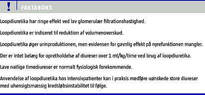 Der er ikke evidens for at opretholde diureser over 1 ml/kg/time ved brug af loopdiuretika eller nyreprotektiv effekt af loopdiuretika hos oliguriske intensivpatienter. Flere forhold peger derimod på en skadelig effekt, især en risiko for kredsløbsinstabilitet ved anvendelsen hos i forvejen kritisk syge patienter.