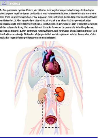 Påvirkning af nyrefunktionen opdeles traditionelt efter prærenal, renal eller postrenal årsag (Figur 1 ). Prærenal nyreinsufficiens, der er udløst af simpel dehydrering eller hypovolæmi, behandles med væskeindgift. Såfremt der ved relevant monitorering er konstateret lavt kardialt minutvolumen, suppleres der med inotropika for at bedre den systemiske perfusion. Ligeledes suppleres der med pressorstoffer ved vedvarende hypotension efter væskeindgift, når dette skyldes lav perifer vaskulær modstand. I denne sammenhæng er relevant monitorering vigtig for at undgå pressorstofmaskeret hypovolæmi, som kan udløse eller forværre AKI. Postrenalt betinget nyreinsufficiens kan erkendes ultrasonisk og aflastes med et velplaceret blærekateter eller nefrostomi. Prognosen vil her afhænge af den tilgrundliggende årsag og varighed af nyreinsufficiensen. Årsagen til AKI hos patienter i intensivt regi er multifaktorel, herunder ofte iskæmisk eller toksisk. Tilstanden kan udvikles efter længerevarende prærenal nyreinsufficiens som følge af hypovolæmi eller kredsløbsshock. Patoanatomisk vil der foreligge akut tubulointerstitiel nefropati (»shocknyre«), som i princippet kræver verificering ved nyrebiopsi. Dette indgreb foretages dog kun sjældent hos intensivpatienter. For AKI gælder det, at der ikke findes specifik behandling ud over korrektion af udløsende årsager og understøttende terapi. Tilstanden persisterer ofte dage til uger, før nyrefunktionen genetableres [9].