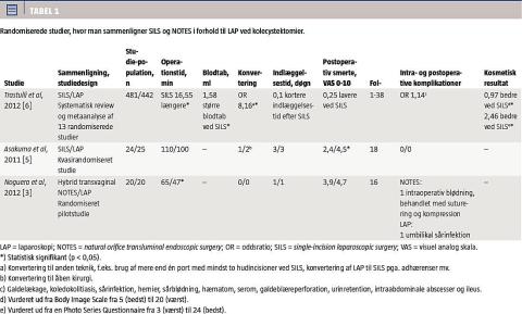 Der findes kun randomiserede data for NOTES og LAP fra ét studie [3] (Tabel 1), hvorfor størstedelen af den tilgængelige viden om NOTES stammer fra mindre, ukontrollerede studier [4, 7].