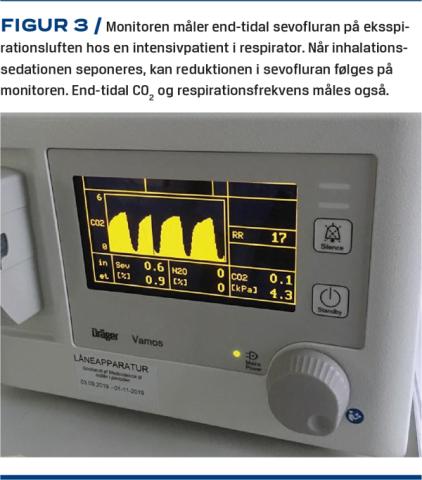 Anæstesisystemet placeres mellem den endotrakeale tube og Y-stykket på respiratorslangerne. Den fungerer som bakteriefilter og heat and moistureexchanger filter for at bevare fugt og varme i de nedre luftveje. Via en infusionsslange tilføres AnaestheticConserving Device flydende sevofluran, som fordamper, hvorefter patienten inhalerer anæstesigassen med inspirationen (Figur 2). Sedation med inhalationsgas er styrbart, da end-tidalsevofluran monitoreres via en måler på eksspirationsluften og en tilhørende monitor (Figur 3). End-tidalsevofluran angives i minimum alveolar concentration (MAC)-værdi eller i procent. Sedationsdybden monitoreres og vurderes med RASS-score og MAC-værdi. Disse justeres ved at øge/sænke infusionshastigheden af sevofluran til AnaestheticConserving Device[7]. Når sevofluran anvendes som sedation af intensivpatienter i respirator er MAC-værdien lavere end ved anæstesiindledning/anæstesivedligeholdelse på en operationsstue [2]. AnaestheticConserving Device reflekterer ca. 90% af den ekshalerede gas, hvorefter der sker en genindåndning [7], hvilket medfører et reduceret forbrug af anæstesimiddel [2]. Metaboliseringen og udskillelsen af sevofluran fra plasma er hurtig og stemmer overens med reduktionen i end-tidalsevofluran, når sedationen seponeres [8].