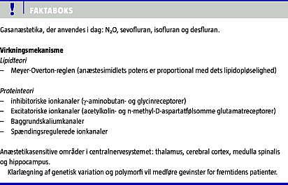 I Danmark udføres der ca. 400.000 anæstesier årligt, men den molekylære virkning af anæstetika er ikke endeligt klarlagt. Flere hypoteser er fremsat, men ingen kan forklare hele mekanismen. Et anæstesimiddels potens er proportional med dets fedtopløselighed ifølge Meyer-Overton-loven. De seneste årtiers forskning viser resultater til fordel for en proteinorienteret opfattelse, hvor anæstetika påvirker visse af nervecellernes membranproteiner, og der derved indtræder en hæmning af excitatoriske systemer og en stimulation af inhibitoriske systemer. I artiklen gennemgås de molekylære mål for gasanæstetika (bl.a. kalium- og kalciumkanaler), påvirkelige områder i centralnervesystemet og gasanæstetikas påvirkning af den cerebrale metabolisme og blodgennemstrømningen.