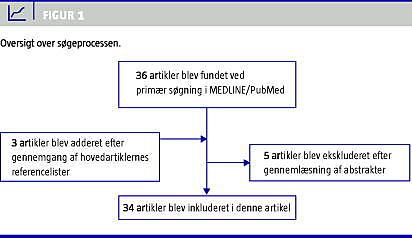 Til den systematiske litteratursøgning er benyttet MEDLINE/PubMed til såvel dansk som engelsksproget litteratur uden fastsatte grænser for publikationsdato eller -status. Der foreligger ingen Cochraneanalyse på området. Følgende søgeord er anvendt: inhaled/volatile anaesthesia i kombination med general, mechanism, positron emission tomography, functional magnetic resonance imaging, electroencephalography, polymorphism og genetic. Derudover er der suppleret med litteratur fra hovedartiklernes referencelister. Søgningen blev foretaget i efteråret 2011, og der er medtaget både primærlitteratur og oversigtsartikler, der omhandler gasanæstetikas virkningsmekanismer. I alt 36 studier blev fundet ved databasesøgning, tre blev tilføjet efter gennemlæsning af referencelister, og fem blev ekskluderet efter gennemgang af abstrakter. Slutteligt blev 34 studier inkluderet (Figur 1 ).