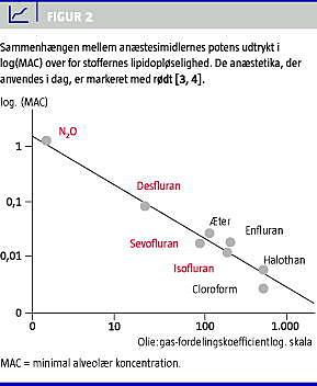 Et anæstesimiddels potens er proportional med dets lipidopløselighed (Figur 2 ). Denne sammenhæng, som gælder for alle anæstesimidler, er beskrevet i Meyer-Overton-loven, der danner grundlag for den såkaldte unitære hypotese, som udsiger, at alle anæstesimidler virker ens. I de seneste årtier er der dog ofte fremlagt resultater til fordel for en proteinorienteret opfattelse [3-6]. Ifølge disse hypoteser påvirker anæstetika funktionen af visse membranproteiner på nervecellerne, således at der indtræder en hæmning af excitatoriske systemer og en stimulation af inhibitoriske systemer.