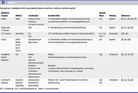 Gasanæstetika nedsætter aktiviteten i CNS ved at påvirke neuronernes evne til at generere aktionspotentialer. Anæstetika påvirker adskillige intracellulære signalproteiner, men en direkte påvirkning af ionkanaler er det mest sandsynlige molekylære mål for anæstetika (Tabel 1 ) [2, 10, 11].