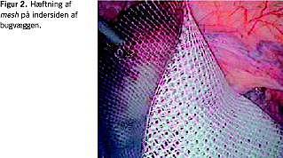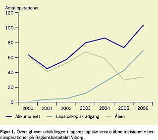 Kirurgiske indgreb i abdomen medfører en risiko for komplikationer i form af utilstrækkelig heling af bugvæggen og heraf følgende incisionel herniedannelse. Risikoen for herniedannelse er størst efter akut kirurgi og efter forløb, der er kompliceret af sårinfektion. I disse tilfælde er der i tidligere studier fundet incisionel herniering efter hver fjerde operation [1]. Foruden kosmetiske gener medfører dette ofte smerter og en øget risiko for ileus. Tidligere har behandlingen bestået af enten konservativ behandling med brokbind eller kirurgisk behandling med forskellige former for plastik. Resultaterne af sidstnævnte har imidlertid været behæftet med en meget høj recidivrate. Således er recidivfrekvensen med åben operation uden indsættelse af mesh opgjort til 30-50% [2]. Igennem de seneste årtier er man gået over til at anvende implantater af syntetisk materiale (mesh-teknik). Forskellige teknikker er beskrevet og kan grundlæggende inddeles efter placeringen af mesh i bugvæggen (på indersiden, imellem eller på ydersiden af fascien). En mesh kan være fremstillet af forskellige materialer og have forskellige udformninger og faconer. Med anvendelsen af en kunststof-mesh er en langt lavere recidivrate på 12-24% beskrevet [3]. Efter udbredelsen af den laparoskopiske operationsteknik foretages også i stigende grad ventralhernieoperation med denne adgang. Som ved andre laparoskopiske operationer har man haft en forventning om en kortere rekonvalescens på grund af færre postoperative smerter og hermed en kortere indlæggelsestid. Der er imidlertid kun få kontrollerede studier, der sammenligner den konventionelle åbne og den laparoskopiske operationsmetode [4], mens en del ukontrollerede opgørelser tyder på kortere rekonvalescens og færre sårinfektioner [1, 2, 5-8]. På vores afdeling har den laparoskopiske adgang siden 2003 været den foretrukne opera-tionsmetode (Figur 1), og vi har fundet det relevant i 2007 at gennemgå de første fire års erfaringer med teknikken på baggrund af journalgennemgang og enquette suppleret med ambulant opfølgning.