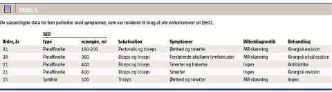 Patienten i sygehistorien havde injiceret synthol og paraffinolie i begge overarme over en årrække. Henriksen et al [2] har tidligere beskrevet injektion af paraffinolie i overarmene, og Munch et al har beskrevet injektion af valnøddeolie [3].