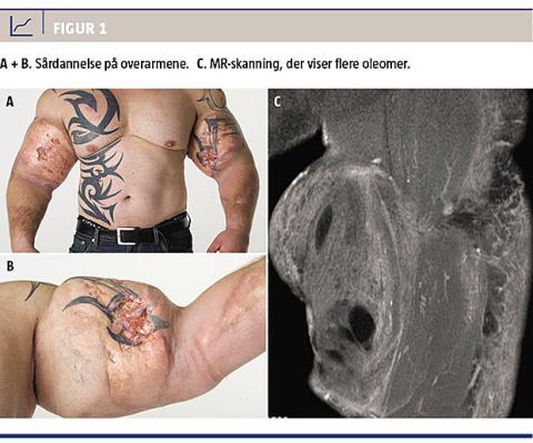 Han blev i 2014 henvist med talrige ulcerationer i huden på bicepserne på begge arme. Hans overarme målte 66 cm i omkreds og havde et deformt udseende (Figur 1).