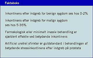 Summary Urinary incontinence after prostatic surgery Ugeskr Læger 2007;169(20):1910-1912 The prevalence of stress urinary incontinence after prostatic surgery for benign disease is 0-2% and 5-35% after surgery for malignant disease. After radical prostatectomy for prostate cancer spontaneous improvement of stress incontinence occurs up to 1 year after surgery. Medical treatment with doloxetine (a serotonine-noradrenaline-reuptake inhibitor) and minimal invasive treatments like urethral bulking and male sling procedures are only effective against minor stress incontinence. Implantation of artificial urethral sphincter prosthesis remains gold standard for effective treatment and lasting effect.