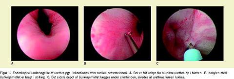 Bulking indebærer, at fyldstoffer (f.eks. polytetraflourethylen, silikone, kulstofbeklædte mikropartikler, autologt fedt eller bovint kollagen) injiceres under uretralslimhinden (Figur 1 ). »Succesraterne« varierer fra 36% til 69%, hvoraf dog kun 4-20% af patienterne bliver helt tørre [1]. Desuden er flere behandlinger ofte nødvendige, ligesom der er tendens til, at effekten aftager med tiden, således at en stor del af patienterne alligevel ender med tilbud om artificiel sfinkter. Bulking anvendes derfor fortrinsvis hos patienter med beskeden inkontinens.