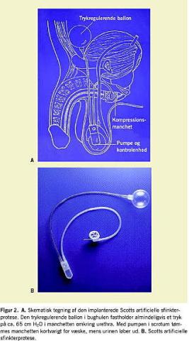 Artificiel urethral sfinkter (AUS) er den mest effektive behandling ved stressinkontinens efter proatataoperation (Figur 2A og B ). Succesraten varierede fra 50% til 87% med behov for 0-1 ble pr. dag i ni forskellige abejder med i alt 415 patienter [1]. »Blefrie« succesrater varierede 10-72%, men alligevel har man fundet konstant høje patienttilfredshedsrater på 87-90% efter AUS. Et særligt problem har været et relativt stort behov for revision, idet kun 50% af proteserne har holdt i fem år uden revision [5]. Langtidsholdbarheden blev påvist i et arbejde af Fulford [6], som efter 10-15 års opfølgning fandt, at 75% af de patienter, som havde fået implanteret AUS stadig havde fungerende device eller var døde med stadigt fungerende AUS.