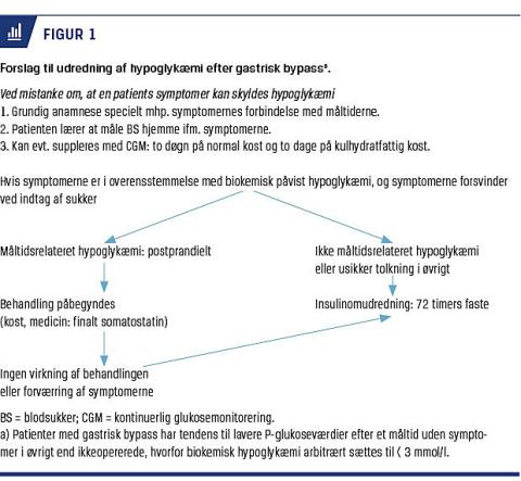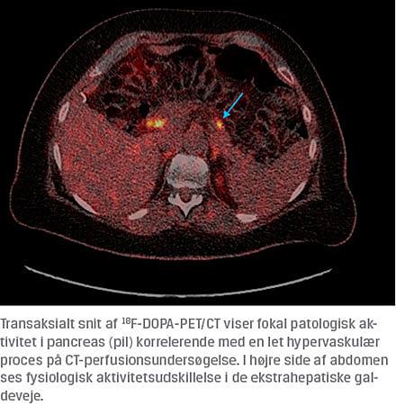 hypoglykæmier efter GB som hos patienten i sygehistorien, hvor hypoglykæmierne også opstod både, når patienten var fastende, og om natten, er det vigtigt at overveje en anden patogenese herunder insulinom, hvor den primære undersøgelse er 72 timers faste (Figur 1). Den efterfølgende lokalisationsdiagnostik er ofte udfordrende, som også illustreret i sygehistorien, hvor fokus først blev klarlagt ved 18F-DOPA-PET/CT med fusion af anatomisk og funktionel information. For år tilbage, da de første svære hypoglykæmier blev beskrevet efter GB, blev det diskuteret, om årsagen var nesidioblastose (excessiv funktion af de pankreatiske betaceller ofte med en grad af hypertrofi og dysplasi) [4]. Det er siden blevet tilbagevist, at dette skulle være en væsentlig årsag, og vi fandt heller ingen tegn på det. GB-operationen synes således ikke at have være årsagen til udvikling af insulinomet hos patienten i sygehistorien. Blandt op mod hundrede patienter med hypoglykæmi efter GB har vi på Aarhus Universitetshospital ikke fundet andre med insulinom efter GB.