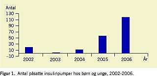 Dansk Selskab for Diabetes i Børne- og ungdomsalderens (DSBD) bestyrelse har netop spurgt de danske børneafdelinger om brug af insulinpumper, og kun på fire afdelinger er man endnu ikke kommet i gang med behandlingen. Figur 1 viser udviklingen i insulinpumpebehandling af børn og unge i perioden 2002-2006. Det skal anføres, at 18 af de unge nu er overgået til voksenmedicinske afdelinger. Der er altså i de seneste år sket en markant stigning i antallet af børn, der behandles med insulinpumpe. I 2006 blev der på landsbasis behandlet 192 børn og unge med insulinpumpe, hvilket svarer til ca. 10% af den totale population med diabetes i aldersgruppen 0-16 år.