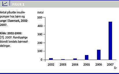 En nylig opgørelse pr. 1. december 2006 viste en klar tendens til stigning af antallet pumpebrugere på danske hospitaler (Figur 1 ). En stigning på cirka 500% fra 2002 til 2006 [7]. Der findes ingen officielle opgørelser for antal påsatte insulinpumper i 2007, men en uofficiel rundspørge blandt medlemmer af Den Danske Studiegruppe for Børne- og Ungdomsdiabetes identificerede ca. 450 nye insulinpumpebrugere i 2007 blandt danske børn og unge.