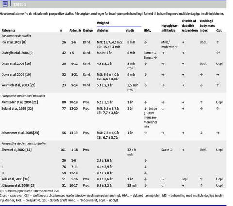 I alt er der inkluderet 25 artikler i denne oversigtsartikel, der falder i følgende grupper: fem randomiserede, tre prospektive kontrolmatchede, tre prospektive ikkematchede og 14 retrospektive studier, som omhandlede insulinpumpebehandling hos børn og unge ud af > 1.400 studier, der beskrev insulinpumpebehandling.