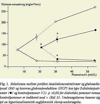 Dette tema har været diskuteret en del igennem de seneste 20 år, men desværre har resultaterne været præget af store metodologiske problemer med måling af leverens glukoseproduktion in vivo (21). Dette skyldes ikke alene problemer ved anvendelsen af tracerteknologien til estimering af hepatisk glukoseproduktion (HGP), men også, at HGP allerede er omkring 60% supprimeret ved fysiologiske insulinkoncentrationer (22). Fasteniveauer af både insulin og glukose i plasma vil således påvirke HGP-værdierne og gøre sammenligninger vanskelige. Imidlertid har man i nye undersøgelser bl.a. fra vort laboratorium vist, at dosis-respons-kurven for suppression af HGP hos type 2-diabetikere er højreforskudt som udtryk for nedsat insulinsensitivitet, mens Vmax (fu ld suppression hos HGP) ikke var ændret (Fig. 1) (5). Denne nedsatte insulinsensitivitet synes at skyldes både nedsat direkte effekt af insulin på glykogenolysen, men også en indirekte effekt, der er forårsaget af insulinresistens i fedtvæv, der medfører øget FFA-tilbud til leveren, som igen stimulerer glykoneogenesen (5).