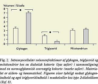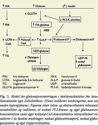 Årsagen til den nedsatte insulinmedierede glykogensyntese synes at være en nedsat glykogensyntaseaktivitet og nedsat translokation af glukosetransportør 4 (GLUT4) fra den intracellulære pool til cellemembranen (9, 10). Om disse to defekter i skeletmuskulaturen hos insulinresistente personer har den samme årsag eller er sekundære til hverandre, diskuteres stadig. Begge er til stede i dyrkede muskelceller fra type 2-diabetikere, hvilket indikerer, at defekterne kunne være genetiske, men FFA synes også at kunne inducere begge defekter både in vivo og in vitro. Således er der en negativ korrelation mellem mængden af Acyl-CoA og triglycerid i muskelcellerne på den ene side og glukosetransport og glykogensyntaseaktivitet på den anden side (Fig. 2) (8, 11). Øget fedtmasse og fedtindtagelse vil således kunne inducere insulinresistens!