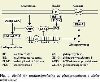 En forklaring på den nedsatte glukosemetabolisme er en hæmning af insulins virkningsmekanisme. Insulinsignalkaskaden i skeletmuskulatur er efterhånden ret godt beskrevet (Fig. 4), men overraskende nok er resultaterne af undersøgelser af nøgleproteiner i signalkaskaden ofte modstridende, idet nogle finder normale forhold, mens andre finder både øget og nedsat aktivitet. Aktiveringen af insulinreceptortyrosinkinasen (IRTK) er blevet beskrevet som både normal og nedsat i skeletmuskulatur hos type 2-diabetes-patienter, mens man har fundet insulinreceptorsubstrat, der er asssocieret til fosfatidylinositol-3-kinase (IRS-PI-3K)-aktiviteten, nedsat i tre studier (15-17). I to af disse studier var de anvendte insulinværdier ufysiologisk høje, mens man i det tredje studie fandt samme aktivitet hos fede personer med og uden diabetes.