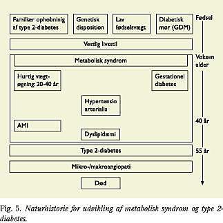 Fig. 5 viser naturhistorien for udvikling af det metaboliske syndrom og dets komponenter inkl. type 2-diabetes. Nogle personer er pga. genetisk insulinresistens, lav fødselsvægt (ikke omtalt specifikt i ovennævnte (25)) eller familære faktorer (social arv) disponeret for udvikling af metabolisk syndrom. Denne fænotype kommer dog kun til udtryk, hvis disse disponerede personer udsættes for den vestlige livsstil, fx fed mad og nedsat motion.