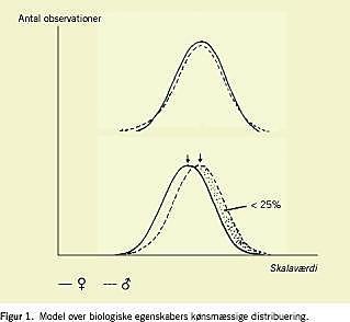 Nogle biologiske kønsforskelle er tilnærmet absolutte. Det gælder kønskromosonerne og kroppens reproduktive funktioner - selv om kønstesting af kvindelige idrætsudøvere, intersextilstande, kønsskifteoperationer og ny reproduktionsteknologi minder os om, at også det tilnærmet absolutte har flydende grænser [3]. Somatiske og neurobiologiske kønsforskelle er derimod af graderet karakter. Her vil forskellene inden for hvert køn ofte være større end gennemsnitsforskellen mellem kønnene. Forskellene fremkommer, fordi der ofte er større spredning i værdierne blandt mænd end blandt kvinder, eller fordi normalfordelingskurverne for hvert køn kan være en smule forskudt i forhold til hinanden (Figur 1 ).